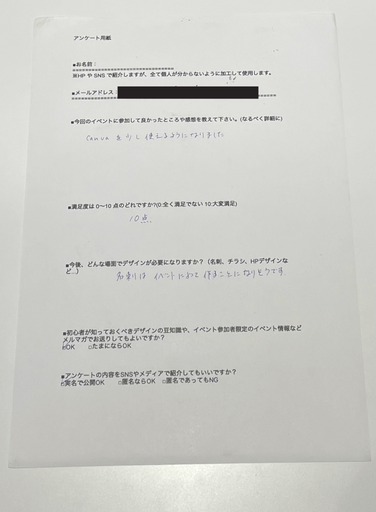 canvaというアプリをを利用しながら、各々で名刺を作ってみて、手を動かしながら、操作などでわからないところがあれば質問していただき、私が操作方法などを伝えるような形式で進めました。